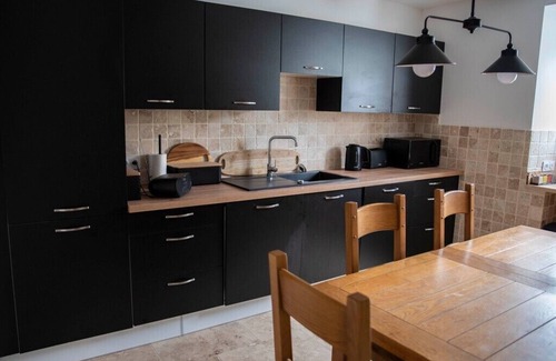 - kitchen with electric hob, electric oven, microwave, dishwasher, refrigerator-freezer, coffee machine, electric kettle and toaster