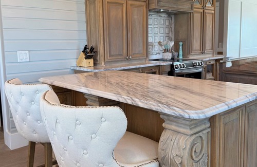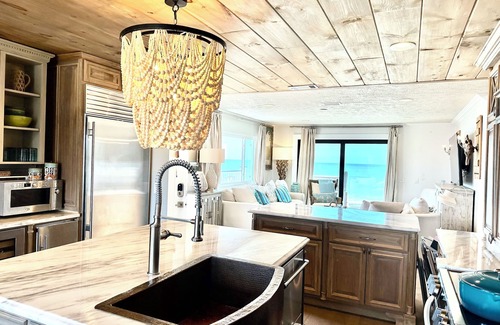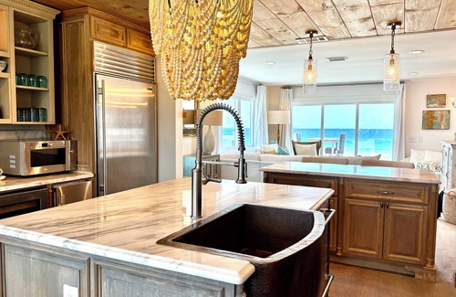 The gourmet open kitchen has beautiful marble counter tops with custom stain grade cabinets, hand scraped European hardwood floors, and upscale stainless steel appliances to include a subzero refrigerator, nugget ice maker, wine chiller, copper farm sink, and copper prep sink. Double islands with bar seating. A beautiful panoramic view of the beach and ocean can be seen from the kitchen, dining and living room areas.