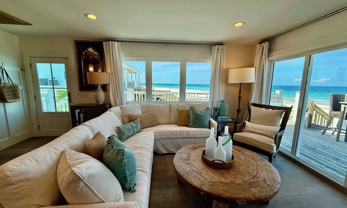 The Gulf front living room features a linen chaise sofa, European hand scraped hardwood floors, 4K UHD Flat Panel internet enabled television with AppleTV. The home has outstanding views in all directions.
