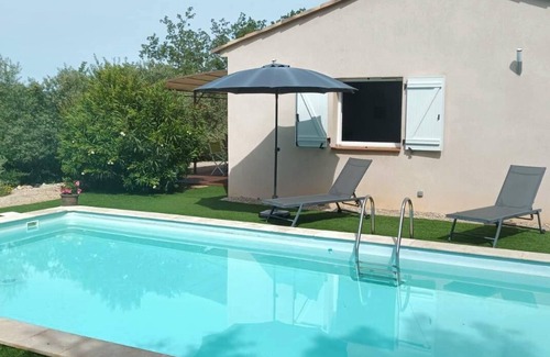 600 m from the Sainte Croix Lake, contemporary House in the heights, in the countryside, with mountain views. Grounds, shaded terrace with garden furniture, plancha. Private swimming pool (4x8x1.2m, open from May to September) secured by alarm, sunbathing. Nautical activities in the Lake. Ideal relaxation and leisure. 1 animal accepted. Table linen provided free. Parking. Ground floor: fully equipped kitchen. 1 bedroom 1 bed 2 place, 1 bedroom 2 beds 1 place. Bathroom with towel. WC. electric heating.