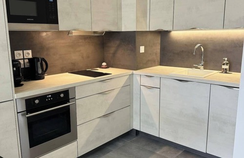The open-plan, fully-equipped kitchen will delight food lovers: induction hob, oven, microwave, dishwasher, fridge with freezer, Tassimo coffee maker, kettle, toaster and all the necessary utensils are at your disposal. For added convenience, a few basic products are also provided (oil, salt, pepper, etc.).