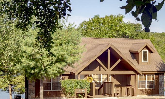 This rustic and beautifully crafted rustic cedar lodge is perfect for lake-lovers. The comfy cabin is a two-bedroom/two-bathroom lodge that sits lakefront on Fox Hollow Lake. Share this getaway with up to 8 family members or friends and create lasting memories as you explore and see the sights Branson offers. The property is just 10 minutes from Silver Dollar City, 10 minutes from Table Rock Lake, and close to several shopping destinations, ensuring that there's something for everyone to enjoy! A short walk away is the Fox Hollow outdoor activity area including a refreshing salt-water swimming pool, sand volleyball court, basketball court, tennis courts, playground, pavilion, and paved jogging track around the lake. The property is located within a gated community with an18 hole signature golf course, rated # 2 Championship Golf Course in the state of Missouri by Golf Digest.