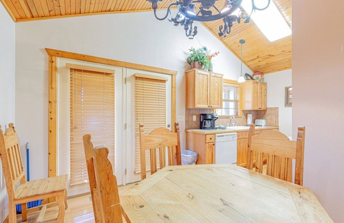 This wonderfully created roughhewn cedar lodge is up a short slope with a look through the foliage at Fox Hollow Lake and a few steps away from a pool, volleyball, basketball, playground, pavilion, and cleared running track around the lake. It includes a well-furnished kitchen, dining area, and a living room. The living room has two armchairs, a queen-size sleeper sofa, cable TV, DVD player, large flat-screen HDTV, and a gas fireplace for the cold months. The dining area has a table and six seats. The kitchen is equipped with a full-size fridge, stove, oven, microwave, dishwasher, waste disposal, washer/dryer combo unit, and a bar with three additional seats. Be amazed at the magnificence of the Ozarks while unwinding on the enormous screened-in back deck. The deck has a glass top porch table with six seats. The two rooms are ace suites with a king-size bed, an armchair, cable TV, flat-screen HDTV, and an appended washroom with a huge whirlpool tub and stroll in shower. Outside Stairs: None (ramp).