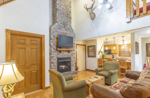 This is the largest lakefront cabin in Stonebridge Resort but the best thing about it is that it is right next to the playground and pool. Grab your pool towel and flip-flops for a short walk to the pool, or just hang out in the screened-in porch and watch the kids play. This four bedroom lodge is a full one bedroom loft lodge connected to a two bedroom lodge with a 3rd loft bedroom. The lockout door can be open to make it into one large unit or it can be closed for extra privacy.
