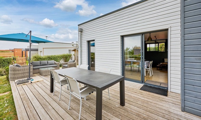 Cocoonr/Book&Pay agency in Les Moitiers-d'Allonne offers you this single-storey house in a very quiet residential park near a magnificent dune massif. The beach is 600 m from the house and can be reached on foot via a magnificent footpath. A children's playground and petanque area are located next to the house. The 67 m² house can accommodate up to 6 guests and comprises a 25 m² living room, an open-plan fitted kitchen, three bedrooms, a bathroom (with shower), a south-facing terrace and a 200 m² garden. Wifi (fiber optics), bed linen and towels included, we're waiting for you!