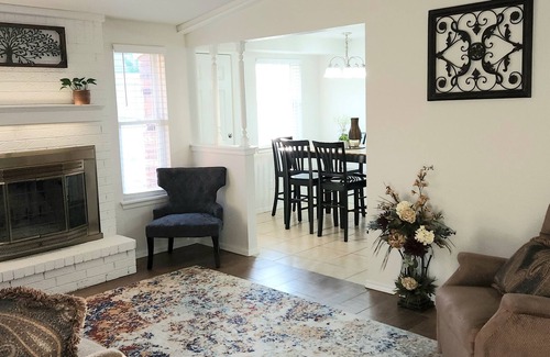 Your family will be close to everything when you stay at this centrally-located place. This home offers 3 bedrooms, 2 living rooms, 1.5 bathrooms with plenty parking space. Underground tornado shelter that accommodates up to 8 people, and large back yard. Located between Buck Thomas and Veterans Park. Minutes away from I-35 and I-240, variety of restaurants and shopping stores near by. High speed WiFi, large smart tv in living room, laundry room, coffee station and loaded kitchen with appliances