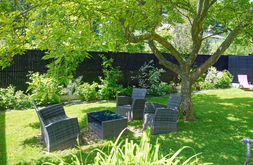 outside, a garden with garden furniture, deck chairs and barbecue.