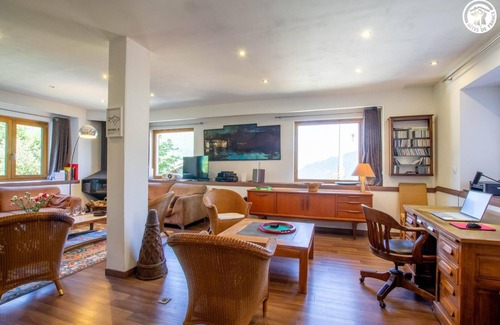Detached chalet comprising year-round accommodation on the first level. Independent entrance via about ten steps below the road. Ground floor: entrance hall, living room-kitchen opening onto a garden, 1 bedroom (1 double bed 160x200 cm), 1 bathroom accessible from the bedroom (walk-in shower), 2 separate toilets, pantry. 1st floor: 3 bedrooms (1 double bed 160x200 cm / 2 single beds 90x190 cm / 2 single beds 90x190 cm / 1 double bed 160x200 cm), office. Pellet stove + electric. Apartment available for year-round rental on the first floor. Apartment with beautiful volumes including a 70m² living room opening onto the garden.
