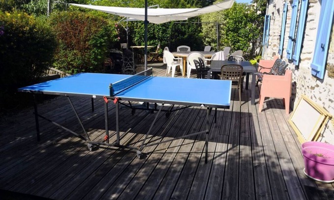 The garden is decorated with outdoor games: ping pong, small slide for toddlers, wooden hut for teens with basketball hoop, swing, trapeze, rope ladder etc ...)