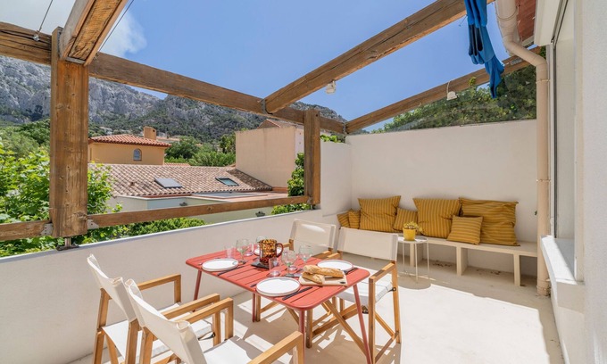 Charming air-conditioned flat with large terrace overlooking the Calanques mountains and the Marseilleveyre forest.