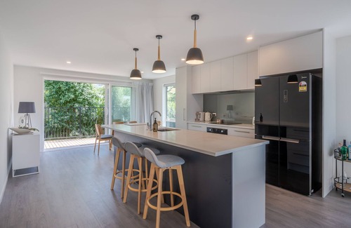 Sliding glass doors from the open-plan living space create seamless indoor-outdoor flow onto the deck. Prepare a delicious charcuterie platter in your fully equipped kitchen and enjoy a glass of wine against the ultimate backdrop; the glass balustrades ensuring nothing obstructs the view over the bay.