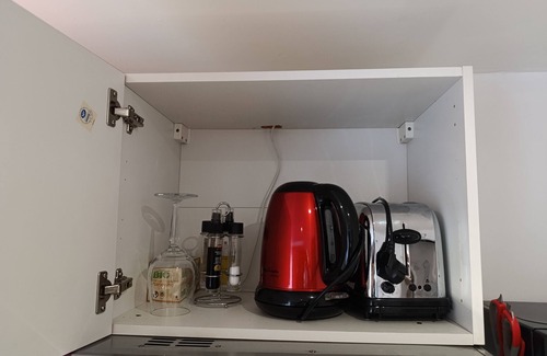 The kitchen is equipped with a stovetop and a refrigerator, as well as a coffee maker, an electric kettle, and a microwave. Bathroom amenities include a hair dryer, towels, and toilet paper. Other amenities include bed sheets, an ironing board, and heating.