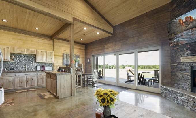 This retreat is a self-contained unit with a full kitchen, living room and a luxurious bedroom with a view of the pond. The rustic and relaxing atmosphere ensures our clients get a break from the hustle and bustle of the city of Austin and yet still be only 25 minutes from downtown. The 300 acre ranch the retreat is part of, has a large variety of mature wild and farmed animals from turkey, white-tailed deer and different types of cattle.