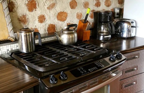 This 2-bedroom, 1-bathroom rental features a living room, a dining area, and a BBQ grill. Bathroom amenities include towels and toilet paper. The kitchen is equipped with an oven, a stovetop, and a refrigerator, as well as cookware, a toaster, and spices.