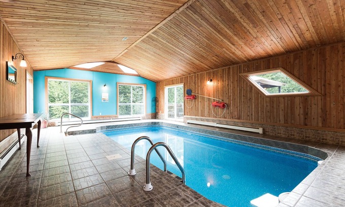 La Tour Boisée is an unparalleled haven of peace! With its huge 6 acres of land, you will feel alone in the world. It's a unique and original construction on an octagonal base where the kitchen is the centerpiece. The latter, with its bluish fresco, allows natural light to enter and gives the impression of greatness. The chalet also has a large heated indoor swimming pool, which will allow you to enjoy both summer and winter!