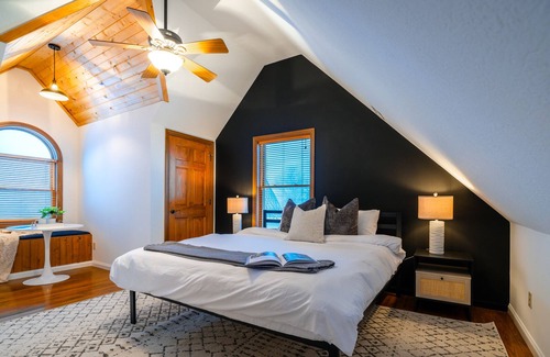 With floor-to-ceiling grand living room window the cabin invites you outdoors! La Vista Cabin is an open-concept home with a large cozy living room and high wooden ceilings, an exposed stone fireplace, and plenty of comfortable seating so groups and families can gather together. The cabin features aesthetic black features and gold accents with modern light fixtures and decor.