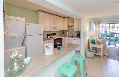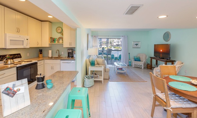 Welcome home to Seaglass150 at Island Club! Spacious, airy, immaculate, newly updated and upgraded 1 bedroom, 1 -1/2 bathroom villa. Raised first floor with large balcony overlooking a beautiful lagoon and fountain. Just minutes to the pool, tennis courts and beach. Step out of the door and walk up the beautifully landscaped walkway to the private beach. No outside streets to cross. This villa is privately owned and managed which allows us to offer many more amenities than a rental company. Seaglass150 is a home away from home and is designed to make your vacation as relaxing as possible. Luxurious thick towels and a new King mattress and bedding. Queen sofabed and two chairs in the living room with games, puzzles and books for cozy nights home. Seating for 4-6 in the dining area plus dining for four on the balcony. Beach towels, chairs, umbrellas, cooler, and much more for the perfect vacation .