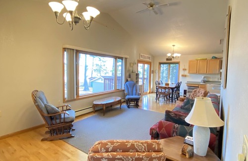 2 bedrooms, 2 baths, kitchen and dining area, living room with views of Lac La Belle and Mount Bohemia.