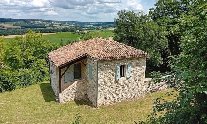 At the top of a hill, the Lacassagne cottage enjoys a beautiful panoramic view of the surrounding countryside. A little isolated, this cottage pleases first of all with its very beautiful high quality renovation highlighting the typical white stone of Quercy, inside, we appreciate the beautiful volumes, the very bright rooms with a refined atmosphere. equipped with the greatest comfort to comfortably accommodate two people! A few steps provide access to the bolet (small covered terrace) which leads to the fully equipped kitchen, then 2 steps open onto the living-dining room with STEINER sofa bed (extra sleeping in a sofa bed convertible into 140), television, a stairs go down to the bathroom (shower, bath, wc) and the bedroom with a 140 cm bed. This bedroom has direct access to the outside. Gas heating by the floor and by radiators in the bedroom and in the kitchen. Unfenced land, overhanging and partially fenced with trees. Possibility of renting for 4 people. 56kwh week included in the rental price, if overrun 10cm per kwh in addition and on meter reading. Heating extra with regard to consumption.