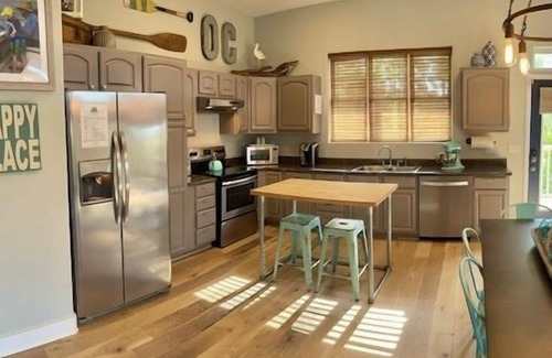 Lavished throughout the interior are designer furnishings and antique accents that welcome guests with cozy vibes. The kitchen is fully stocked and equipped with brand new Frigidaire appliances. The living room entertainment includes a 50” Samsung Smart TV and blu-ray player, fishing library, and board games. A movie collection and childrens library are neatly displayed in the living room closet.