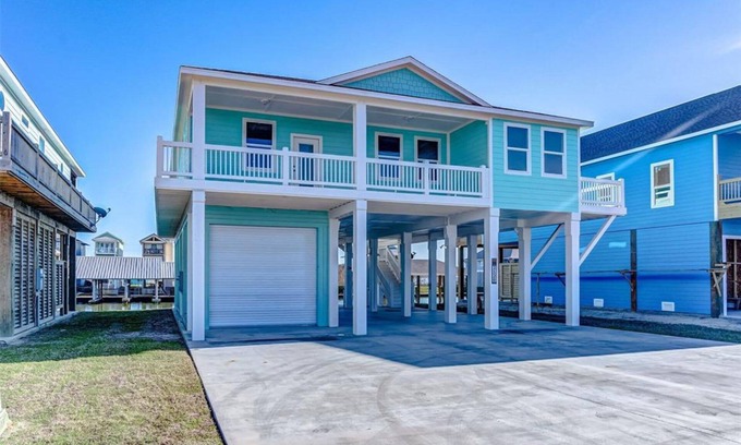 Enjoy the stunning 360 degree views at this beautiful newer home in the gated community of Laguna Harbor. This canal front home boasts all of the thoughtful features you would expect in a custom built coastal home - and then some. With such great features as an RV garage with a 30 AMP connection (with an additional fee) and an outside shower. You will appreciate the thought that went into the construction of the home. With a wrap around porch you will surely enjoy the variety of vistas regardless of the season. You are welcome to tie your boat off at deck behind the house. You can see both the Gulf Coast and Galveston Bay from the porches/decks.
