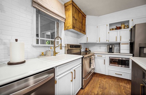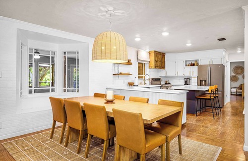The modern kitchen comes fully stocked with everything you need: stainless steel appliances, cookware, bakeware, coffee maker, and more—making group meals a breeze.
