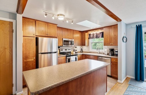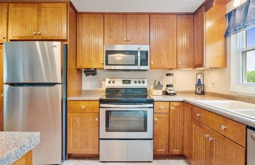 The fully stocked kitchen makes mealtime a breeze with ample counter space and stainless-steel appliances.