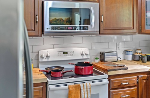 * Kitchen stocked with essentials, including an air fryer, coffee maker, French press, blender, electric kettle and toaster. Filtered water on fridge and automatic ice maker in freezer.