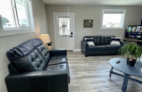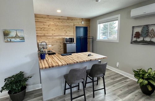 This bright and airy space features a private entrance and completely private unit housing a kitchenette, living room, bathroom, and queen size bed. The kitchenette comes equipped with a fridge with freezer, induction hot plate, air fryer/toaster oven, microwave, pour-over coffee, utensils for all of your meal needs, and large bar dining area with cushioned stools. With plenty of desk/counter space, this could also serve as a work area as the unit has fiber internet with speeds between 500-1000mbps. The living room boasts a large sleeper sofa with matching loveseat, both perfect for lounging and chatting with loved ones. The 55” TV is ready to go with all your favorite complimentary steaming services for movie nights in. Take a luxurious soak in the tub, and sleep soundly in the memory foam bed. While some noise from cars can be heard, the large air filter next to the bed doubles as a noise machine. A mini-split allows you to choose your comfort level for temperature. While we love furry friends, no pets are allowed in this unit.