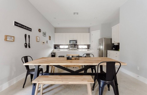 The Vast, open floor plan leaves plenty of space for group activities and peaceful lounging around the home. The calming grey/white color scheme brings a tranquil vibe and helps keep the house cool. Cooking for a crowd is a breeze in our large open kitchen, with modern stainless steel appliances.