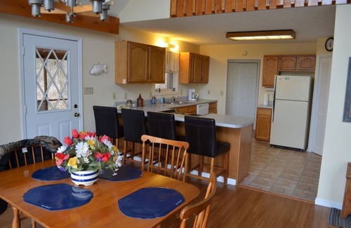 This three bedroom home with a pull-out bed in the loft can comfortably sleep up to 10 people. It is located on Lake Barkley, just 3.2 miles from the Lake Barkley Lodge and all of its amenities (excellent boat ramp and dock, golf, tennis, dining, beach, fitness center, and gift shop.) The house is located in Blue Spring Bay offering fishing and water sport opportunities. The master suite located upstairs has a king bed with a walk-in closet and spacious bath. There are two bedrooms on the first floor. One with a queen bed and the other has two twin beds and a set of twin bunk beds with a walk-in closet. The rental does not include the lower walk-out level, which is a separate apartment with no shared access used by the owners occasionally on weekends.