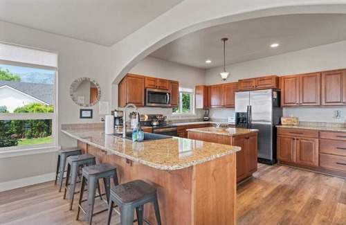 This spacious home features modern furnishings and room for the entire group to have their own space or conglomerate in the open kitchen, dining and living room area. With the abundance of space, this home is perfect for couples, groups of friends, or multi-generational families.