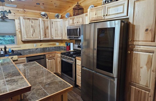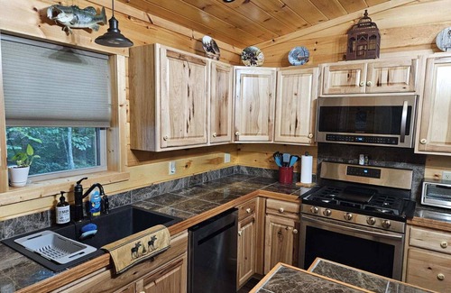 Newly constructed cabin on the hills of Lake Cumberland. Idyllic setting with extra amenities inside and out. Perfect for the weekend fishing trip, guys weekend, or your family vacation on the lake! You'll have plenty of parking for your water toys, so bring your boat, jet ski or kayaks and launch them at the ramp at the end of Jones Road. No boat? No Worry! This ramp offers easy walk in and float access or shore fishing. The custom kitchen offers everything you'll need to enjoy your meals, or you can choose to grill outside on the Blackstone in the BBQ Shack. Outside you'll also find the Sauna Shack with both a wet and dry sauna to melt away all your stress! When you aren't enjoying the outdoors, you can rest inside with smart TV's in each bedroom and living room. The first bedroom is outfitted with custom-made log furniture, while the second bedroom has the extra sleeping space you need with a "twin over full" bunk bed. The bathroom has extra design details and a walk in, rain head shower. We invite you to come and enjoy the cabin that we like to call "Pigeon Forge at the Lake"! No crowds or traffic. Just relaxation!