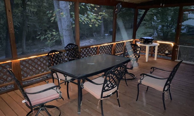 Enjoy your time sitting on the large screened in porch or around a campfire when not on the lake. Don't be surprised to see deer or turkeys with your morning coffee and hear the boats on the lake. Have a Mobile Home with 2 bedrooms (1 king, 1 full, and queen couch bed). Kitchen with microwave, stove, refrigerator/freezer, utensils, plates and cups. Also has Wifi, TV, AC, washer and dryer. Unit has bedding, bath and beach towels for your use.