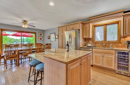 The main level is open concept for the kitchen, dining and living rooms. There is a wood burning fireplace insert in the living room, which is surrounded by a 2-story stone hearth that rises to the upper level interior balcony. Large windows practically bring the outdoors in with extensive views of the lake. The dining room has seating for 10 at the table, and the large gourmet kitchen has a center island with addition seating for four. Dancing Water has a nicely appointed kitchen featuring granite counter tops and stainless-steel appliances and is well stocked. The home is also located near several great restaurants within driving or boating distance, and is convenient to a grocery store and two vineyards. When grilling, the deck offers seating for up to 12 people. Also on the main level is the first of three large Master Bedrooms, each one with a king bed.