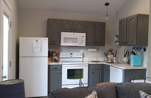 This open-concept lake themed cottage is the perfect getaway! It has standard kitchen appliances for the option to cook after a long day at the lake. Dive into the queen size bed for a great night sleep. The cottage is just over 5 miles (10 minutes) to the lake. Bring your boat and park right outside the cottage (outside plugs available.)