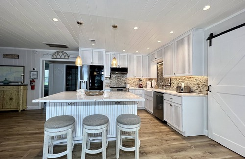 A beautiful large screened porch with seating and a gas bbq grill is right outside the door covered with an outdoor sink and counter for fish cleaning and cooking!
