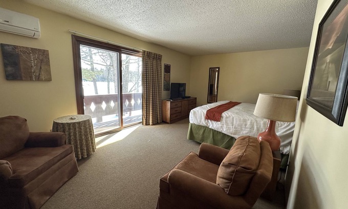 Step outside and enjoy the resort’s pristine sandy beach, perfect for swimming, sunbathing, or simply soaking in the breathtaking lake views. Cast a line and experience excellent fishing, or take the little ones froggin’ along the shore. Walk across the footbridge to the lagoon, where you can watch for turtles, hear the call of spring peepers, and take in the sounds of Mother Nature’s choir. Wildlife is everywhere—loons, eagles, deer, and more—making every moment a chance to connect with nature. Need a dock? Just let us know at the time of booking!