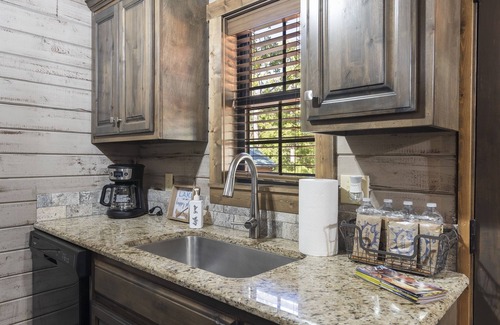 As you step inside you will be greeted with a rustic interior with modern furnishings creating a warm and inviting atmosphere. Unwind in the living area after a long day, offering plush seating and flat-screen TV for entertainment. When it's time to retire for the night, you'll find comfort in the well-appointed bedrooms. The master bedroom boasts a King size bed with private en-suite bathroom. The second bedroom with queen size bed and twin over twin bunkbeds will be a hit for the kids. The living room couch also turns into a sofa bed to sleep up to 8. The Kitchen is stocked with basic cooking utensils and all the modern appliances including fridge, dishwasher, stove and a microwave. Bring your favorite coffee for the drip coffee maker, and savor your morning brew on the patio as you soak in the beauty of the surrounding landscape. In the evenings, fire up the charcoal grill and enjoy a barbecue feast.