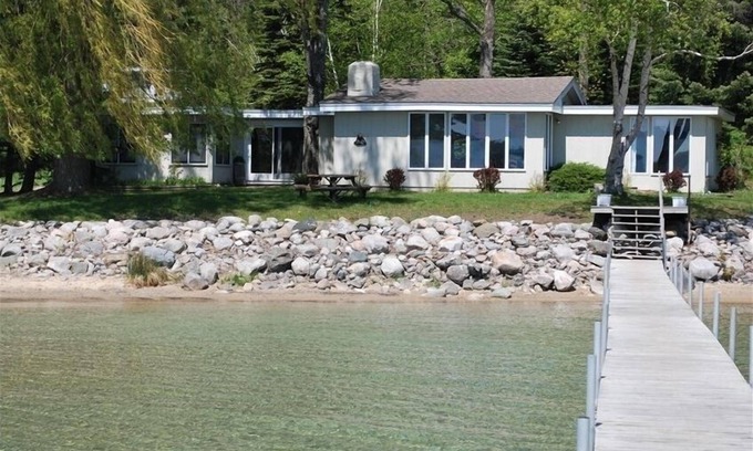 Beachfront ranch style home on beautiful Lake Charlevoix. Relax with your favorite cocktail on your own private beach while watching your children play in the sand and swim, or tell ghost stories by the campfire at night. 3 Bedrooms, Master Bedroom has a queen size bed and full bath. 2nd Bedroom has a full bed, and 3rd bedroom has 4 twin size trundle beds. Additional pull out full-size sofa bed and pack n play available. Nearby shopping includes downtown Petoskey, Boyne City, and Charlevoix. Wave Runner/Boat rental nearby...lots of fishing. Close to Dunmaglas golf course and Charlevoix Country Club.