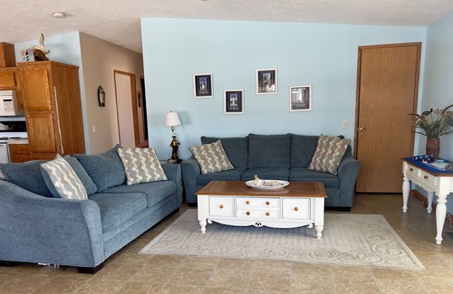 The cottage has 2 bedrooms, 2 bathrooms, a full size hideaway sofa/bed, a three seasons room, washer/dryer, and an open floor plan living, dining, and kitchen area. We have a fire table and Adirondack seating to the backyard for viewing those perfect sunsets. We also have WIFI for those who need to stay connected and the home is handicap accessible so everyone is welcome to enjoy the getaway.