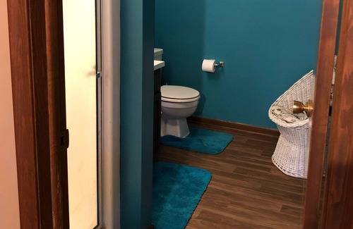 The guesthouse/garage apartment is two bedrooms and two baths and can accommodate 12+ people. Our home and guest house is on a 2 acre lot and has a long private, wooded driveway with plenty of parking. The house has a full kitchen and completely equipped, a dining area, and a living area with a fireplace. The home has an additional living area on the lower level. The private deck is a great place to eat, sit, talk, and take in the sunrise and sunsets. If you choose to use the gas grill you must bring your own tank. A charcoal grill is also available for use.
