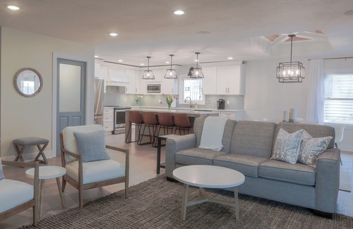 Back inside the house there are 3 main bedrooms off to one side of the house with beds to sleep 8, as well as an expansive back Great Room with a 85" TV and Sonos sound system along with additional beds to sleep 6 more. This is a great setup for 2 or 3 families that would enjoy their own space for their sleeping arrangements. The master bedroom features a pillow top king size mattress and a private bathroom.