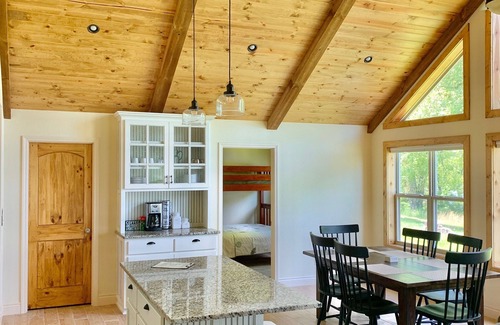 The living area invites you to unwind on the comfortable sectional and loveseat while streaming your favorite shows or movies on the large flat-panel smart TV with YouTube TV. A Sonos speaker allows you to fill the space with your favorite tunes, whether from your own library or streaming services like Pandora or Spotify. WiFi is available throughout the cabin to keep you connected.