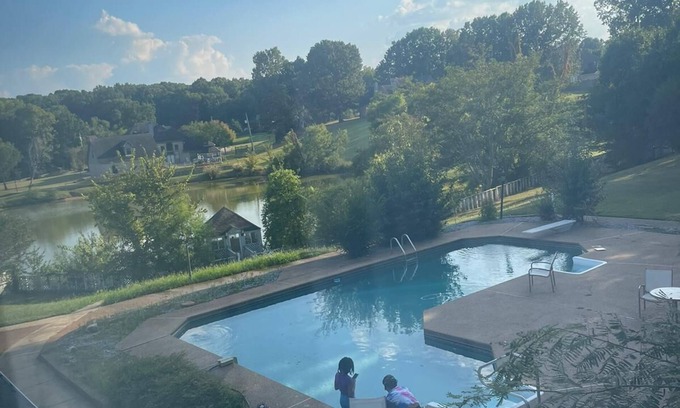 Sprawling Lake front Estate Home with Pool. Over 6000 square feet with 7 bedrooms plus bonus room. There are 9 king beds, 7 singles, and 3 Sofa bed. A basketball court is also next to the Kitchen. This is living the highlife while in Elvis Presley Country. Fully Fenced and gated. Smart TV in all of the bedrooms. There are 3 dining area for larger Group. Very long Driveway for parking, leads you to this elegant home. Children's playground also is present.