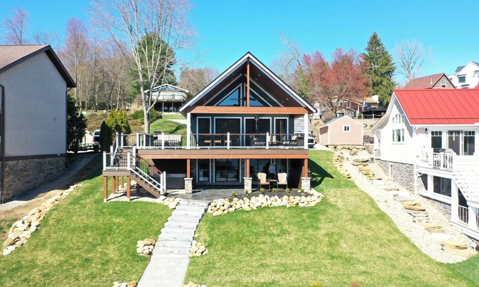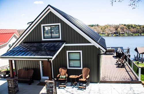 Escape to Lakeside Paradise at Apple Valley Lake, a luxurious home for 10 with 4 bedrooms, a great room, dock bar, walkout to the lake and a fully equipped kitchen. Enjoy stunning lake sunrises, relax on the expansive deck or the lakeside patio with a fire pit, and unwind in the 6-person hot tub. Perfect for serene evenings, our home includes a bar and entertainment area, and sits in a calm no wake zone for safe swimming. Experience comfort and elegance in nature’s embrace.