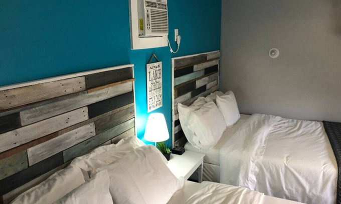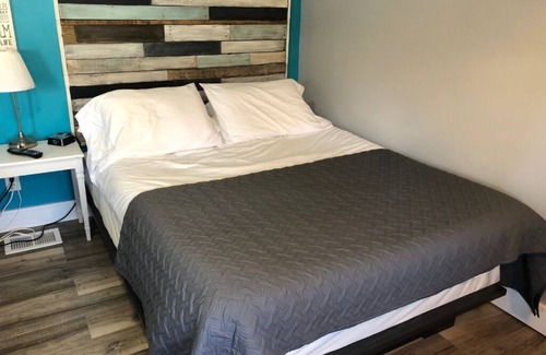 Room 7 at Alexander’s Landing offers a cozy and scenic lakefront retreat, perfect for couples, small families, or friends looking to relax by the water. This one-bedroom unit features two comfortable queen beds accented by stylish reclaimed wood headboards and a bright, welcoming decor. A full kitchen—including a stove, microwave, refrigerator, toaster, and cookware—makes in-room dining easy, while a small dining table positioned by the window lets you enjoy meals with a view.
