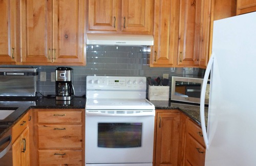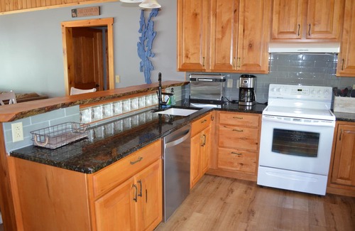 The Great Room has a wooden vaulted ceiling with a sectional couch that can comfortably seat all guests. Two sliding glass doors off of the Great Room provide an abundance of light, easy access to the deck, and non-stop views of the Lake. Adjacent to the great room is the open kitchen that contains a large farmhouse table that can accommodate up to eight guests, a bar top counter, and a fully stocked kitchen. The kitchen contains full size sink, dishwasher, electric stove, microwave, coffee maker, air fryer. Extra appliances such as a blender, pressure cooker, and toaster are also available and stored in the kitchen cabinets.