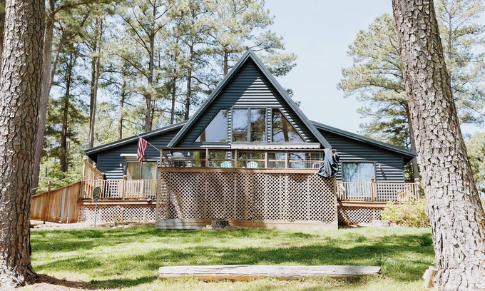 Waterfront home with a private beach and dock! Located on a quiet cove off the main lake. The A-frame features two master suites and a loft sleeping area with 4 single beds. Large deck for enjoying sunrises or grilling out. Private beach allows you to walk right into the lake or jump off the end of the dock. Launch your boat just down the road and dock it at the house. Paddle board and 2 single kayaks for your use!