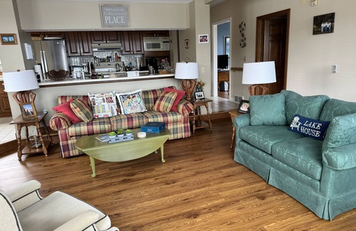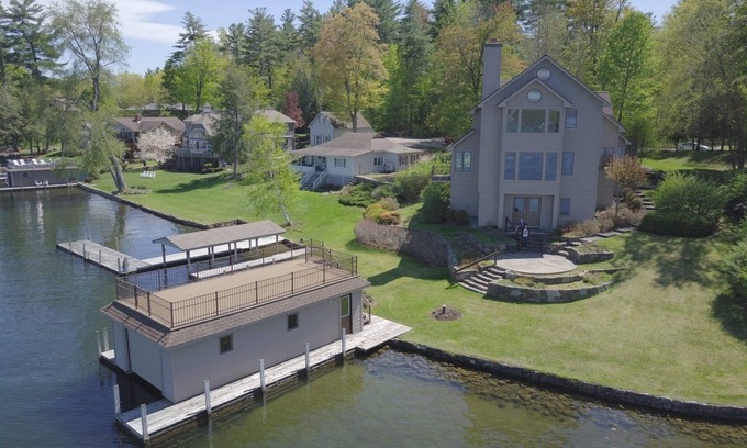 Great Lake front house with views up Harris Bay and Long Island. House has a room with bed on first floor. There are 3 bedrooms on the second floor. Galley kitchen with eat in area with seating for 6, all windows have lake and mountain views from eat-in area. New fridge and dishwasher, Keurig/ new Mr. Coffee, microwave/convection oven, electric cook top, and gas Grill. Also on first floor is living room, great room, half bath, sun room. Second floor with large master bedroom that has spectacular views of and up the lake. Master has King bed and full master bath, and two guest bedrooms with 1 full-sized bed and one new queen bed. Guest rooms share a full hall bath. The lower finished level has another full bath. The washer/dryer and rec room is there as well.